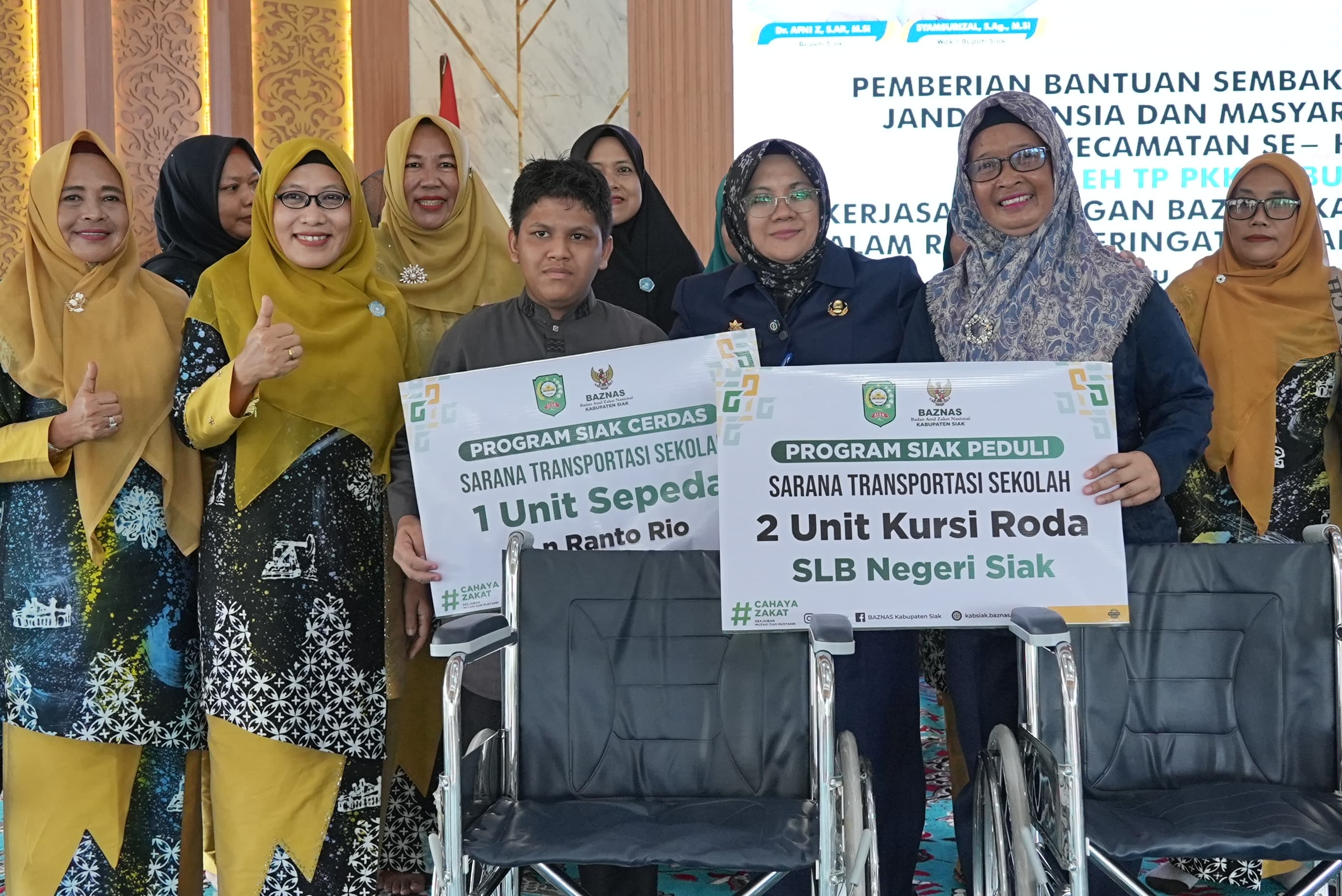 Dua unit kursi roda untuk siswa SLB Negeri Siak atas nama Reply Muhammad Harun dan Rifki Azriansah. Bantuan seragam sekolah gratis tingkat SDN, SMP se-Kabupaten Siak yang diproduksi oleh UMKM binaan BAZNAS Kabupaten Siak.